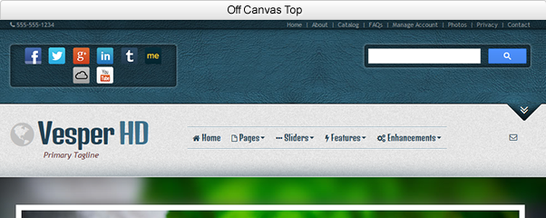 The Off Canvas Top is a new method of providing full functionality to a web page, while also allowing that page to keep a clean and uncluttered look to it. The Off Canvas Top allows the visitor to expand an additional hidden section at the top of the page. The Off Canvas Top included in your template pages includes a Google Search component, Social Networking Icons, and additional text links. All components are optional, and you can insert your own content or components it you prefer.